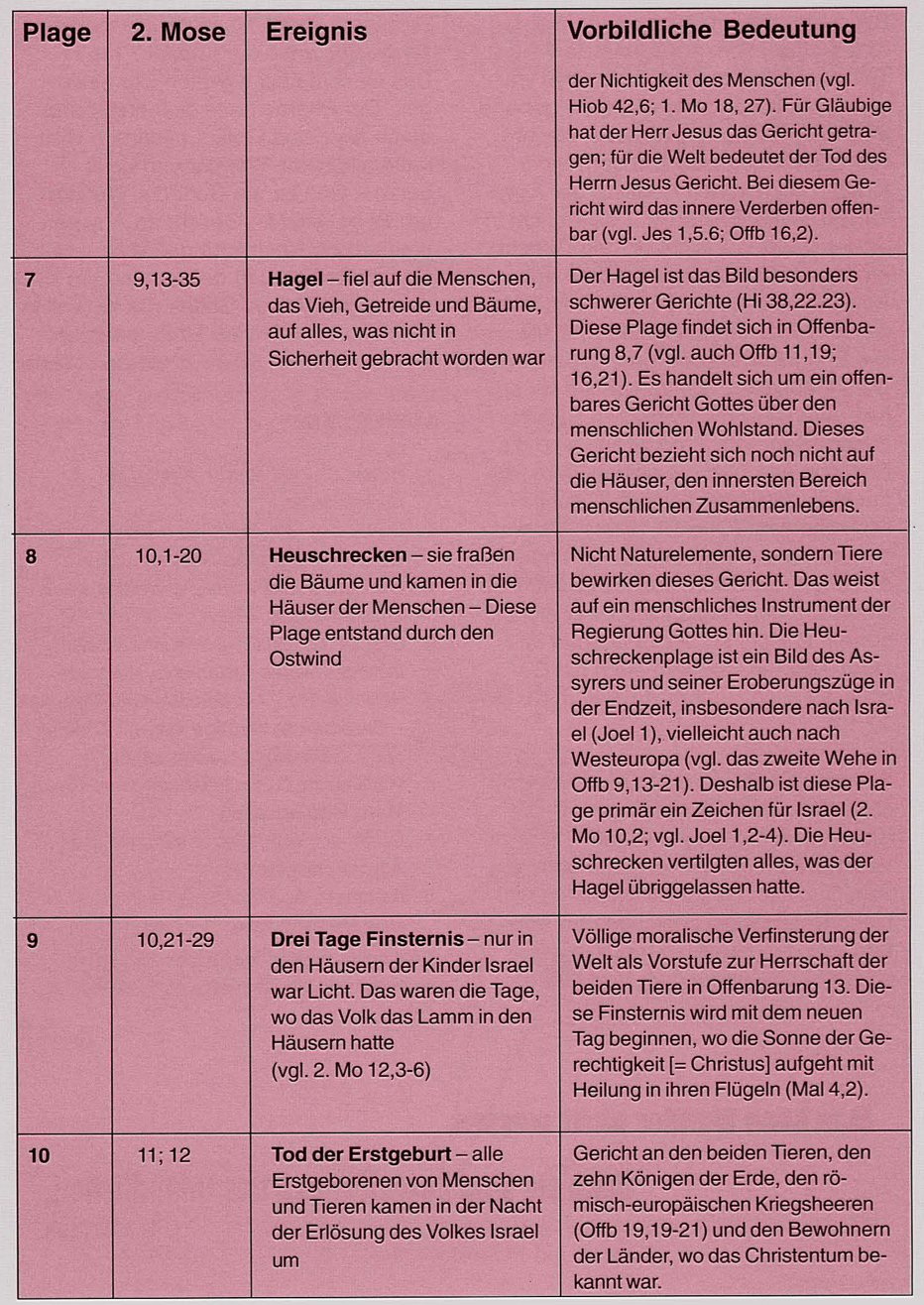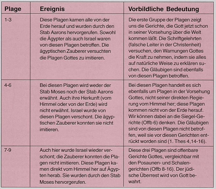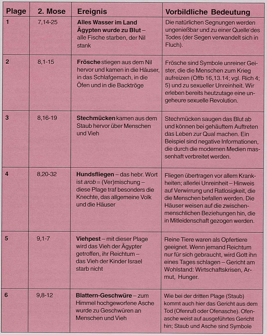 Diese Tabelle bietet eine Übersicht in gestraffter Form; wer sich eingehender mit diesem Thema beschäftigen möchte, dem empfehlen wir das kleine Büchlein Die zehn Plagen über Ägypten (s. Schluß).