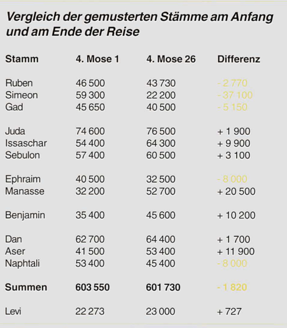 Das Buch beginnt mit einer Zählung (= Musterung) der einzelnen Stämme, und zwar aller wehrtüchtigen Männer (Kap. 1). Am Ende der Wüstenreise geschah eine erneute Zählung. Manche Stämme haben viele wehrpflichtigen Männer verloren, andere haben welche hinzugewonnen. Insgesamt wurden 603 550 Männer gezählt. Danach finden wir eine Anordnung der Lagerplätze der einzelnen Stämme um das Zelt der Zusammenkunft und die Reihen-folge, in der die einzelnen Stämme beim Weiterziehen aufbrachen.