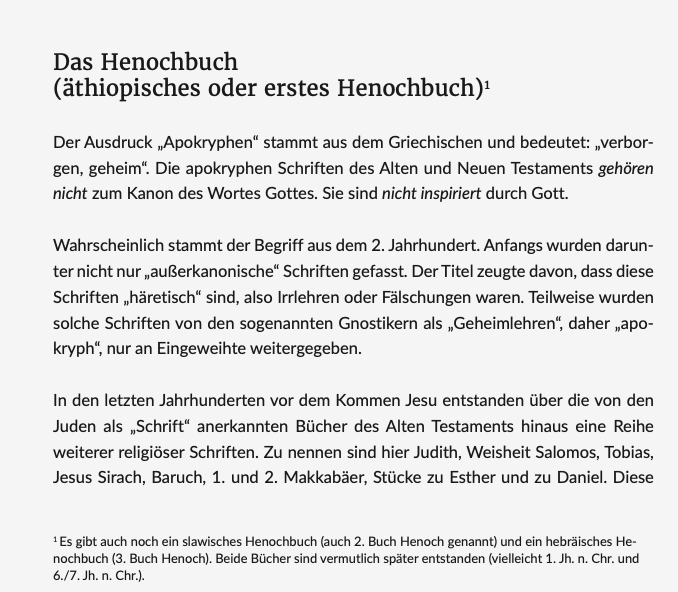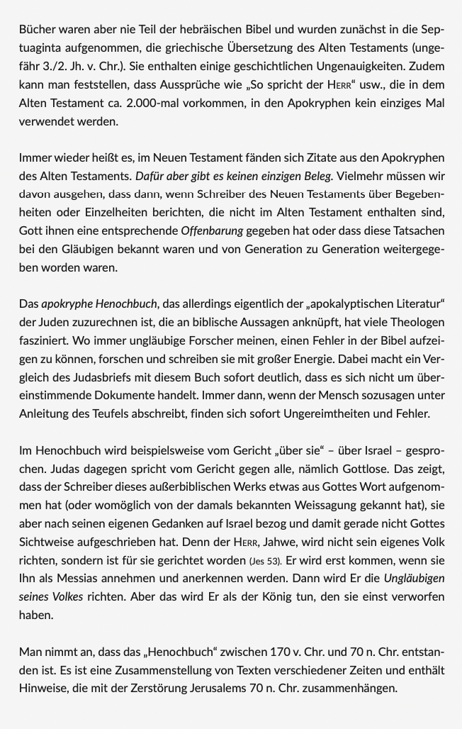 Der späte Bericht über diese Prophezeiung bedeutet nicht, dass sie unbekannt war. Viele haben sich gefragt, woher Judas die Weissagung wohl kannte. Ungläubige Theologen denken dann nicht zuerst an Gottes Offenbarung, sondern daran, dass Judas dies aus den Apokryphen entnommen hätte (siehe den beigefügten Kasten). Was bleibt dem Unglauben auch anderes übrig? Als Gläubige aber wissen wir, dass Gott eine womöglich damals nicht mehr bekannte Weissagung Henochs durch eine persönliche Mitteilung an Judas weitergeben konnte. Ebenso ist es möglich, dass die Weissagung „geläufig“ war, denn Henoch hatte sie ja verbreitet.
