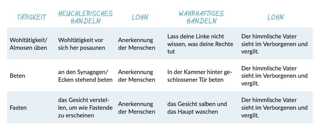 In Matthäus 6 wird ein heuchlerisches Handeln dem wahrhaftigen Handeln gegenübergestellt, auch im Hinblick auf den Lohn. Dazu eine kleine Übersicht: